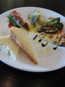 左)ハモンセラーノとドライいちじく、秋刀魚のマリネ、野菜のグリル、ズッキーニフリッタ、フォカッチャ