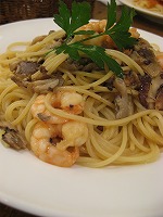 エビとキノコのパスタです。