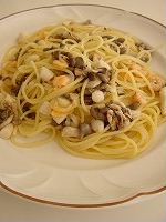 ↑今日のブランチは、シーフードとしめじのパスタ。