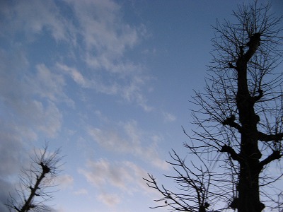 夕闇せまる並木道の空